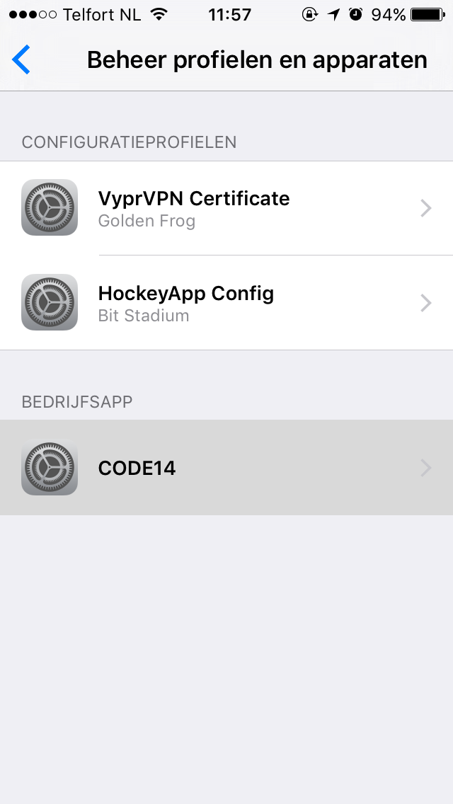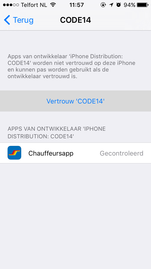 - Bij de eerste keer openen van de app vraagt hij of je de 'code14 enterprise' vertrouwt. Dit graag doen, anders opent de app niet